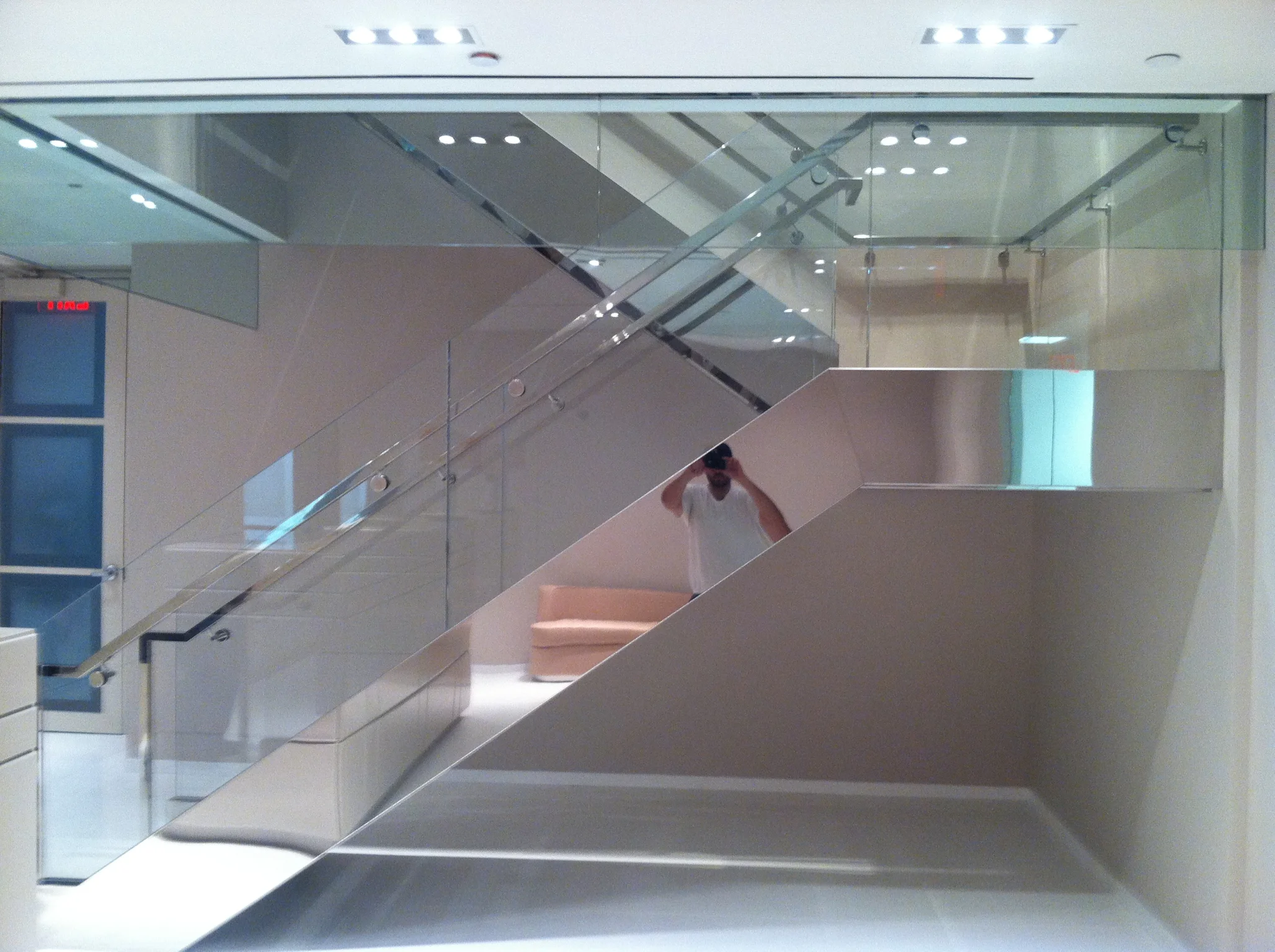 staircase made of steel and wrapped in polished stainless steel. glass railings with tubular polished stainless steel.