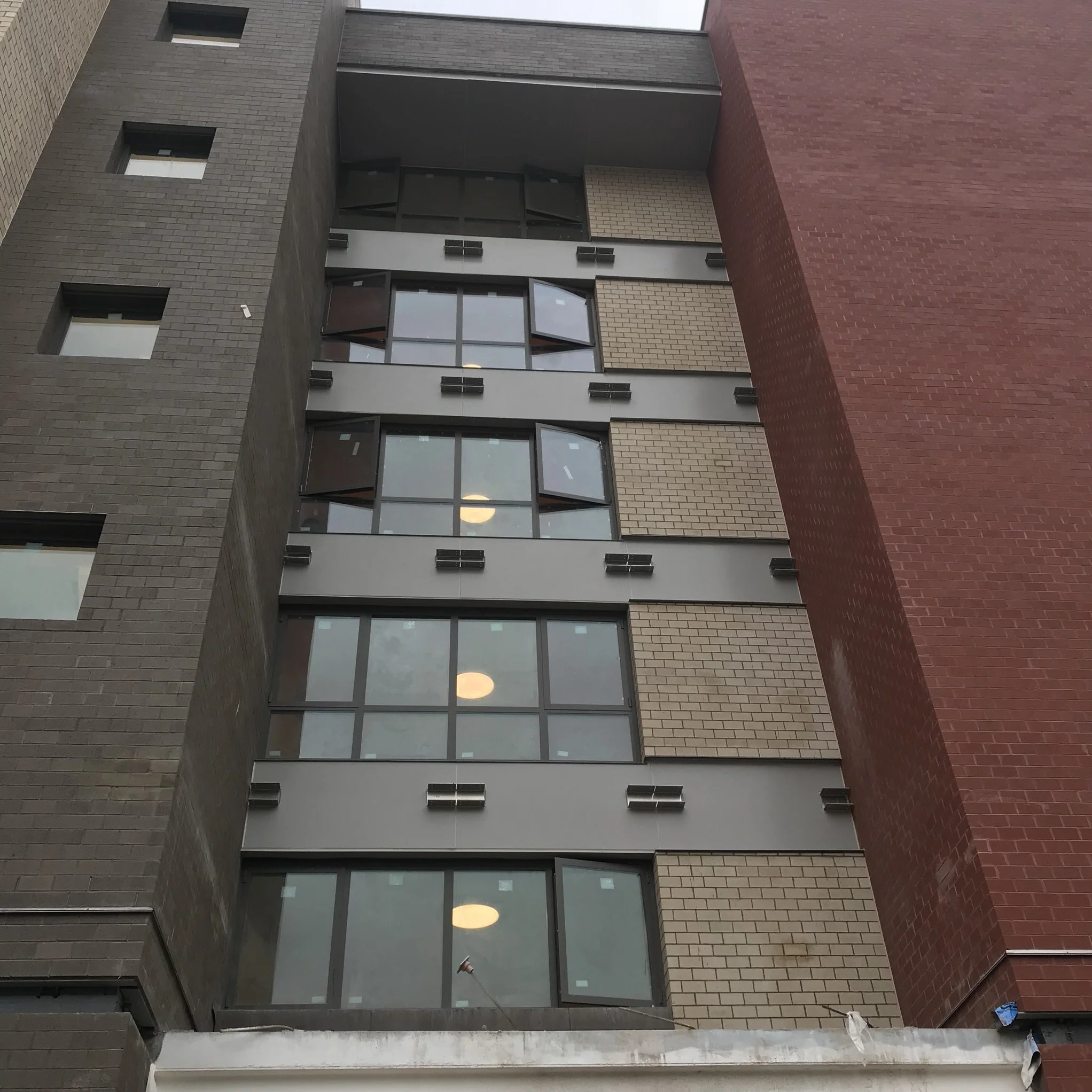 NEW CONSTRUCTION BUILDING. THERMALLY BROKEN STOREFRONTS, ALUMINUM METAL PANELS AND ALUMINUM SUNSHADES.
