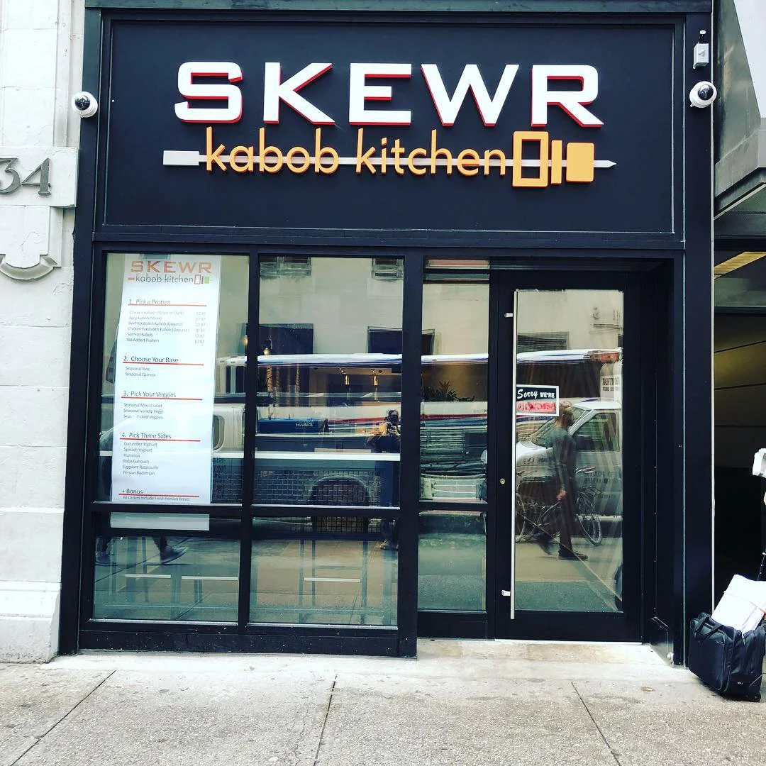 DARK BRONZE ALUMINUM STOREFRONT WITH CUSTOM SIGN BACKING AND STOREFRONT TRIM. INTERIOR STEEL BAR HEIGHT TABLES WITH STEEL WIRE MESH. STEEL QUE LINE WITH WOOD ARROWS. BLACK SNEEZE GUARD POSTS WITH 3/8” THICK GLASS